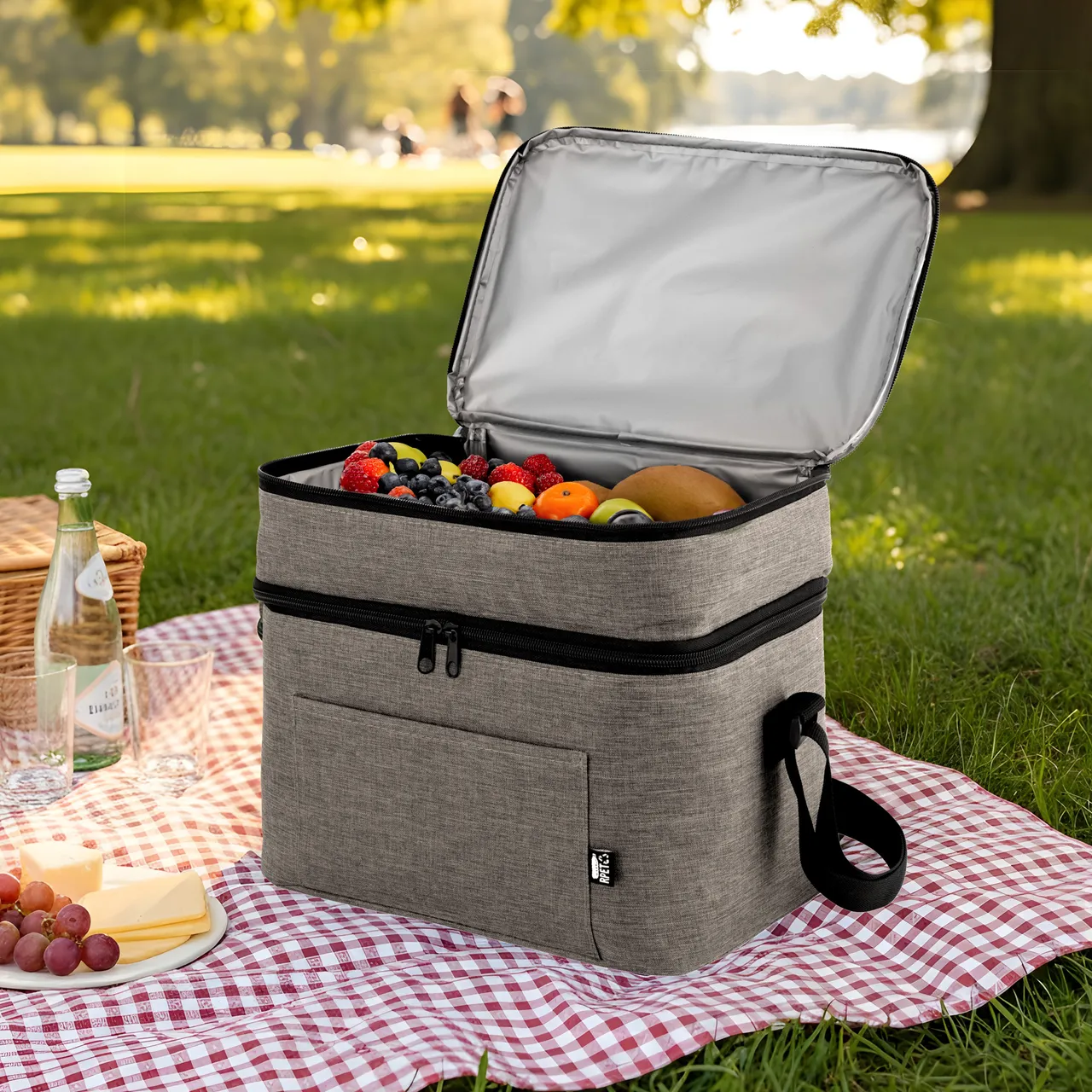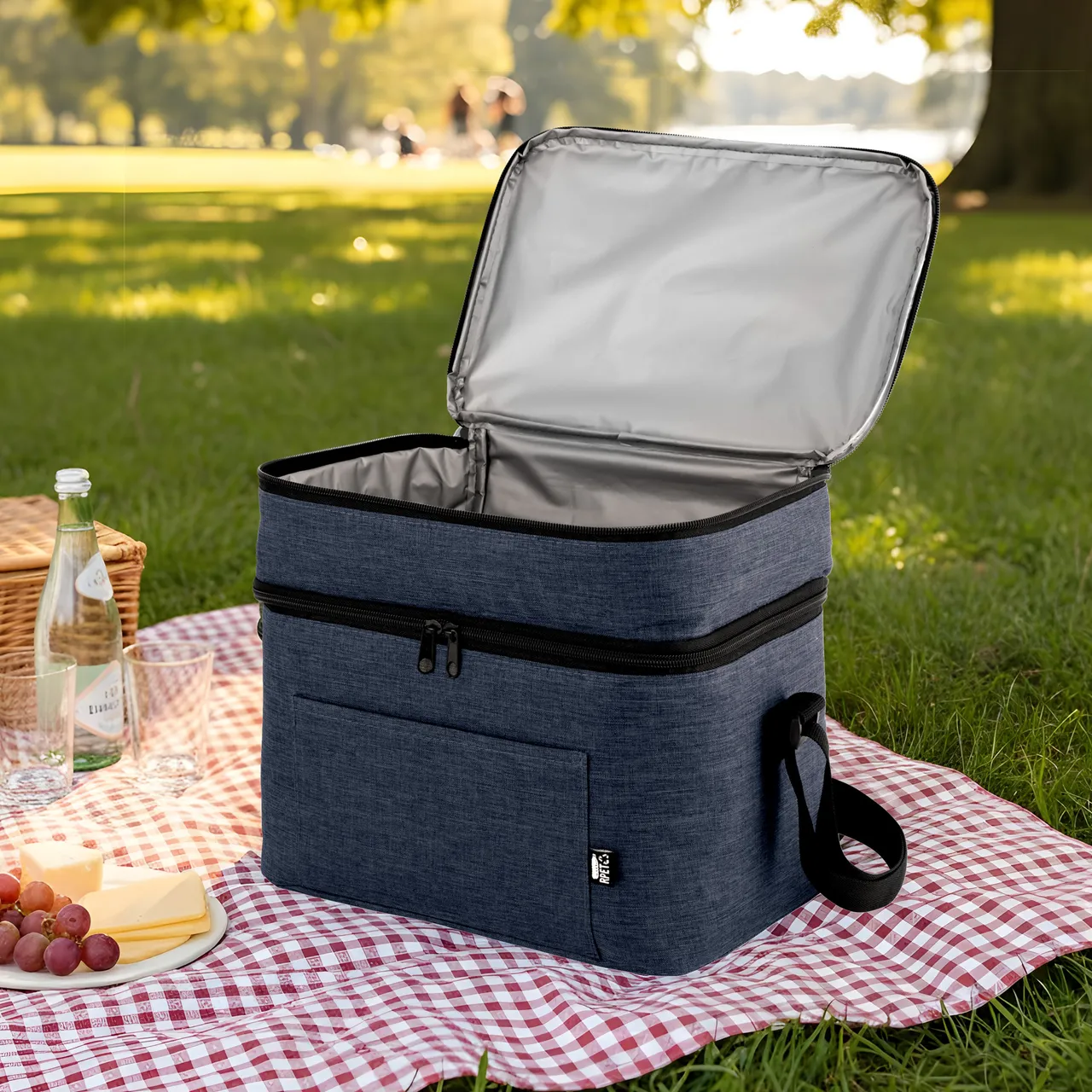 Materiales: Exterior de poliéster 300D recubierto de RPET. Interior de espuma de polietileno recubierto de PEVA.
